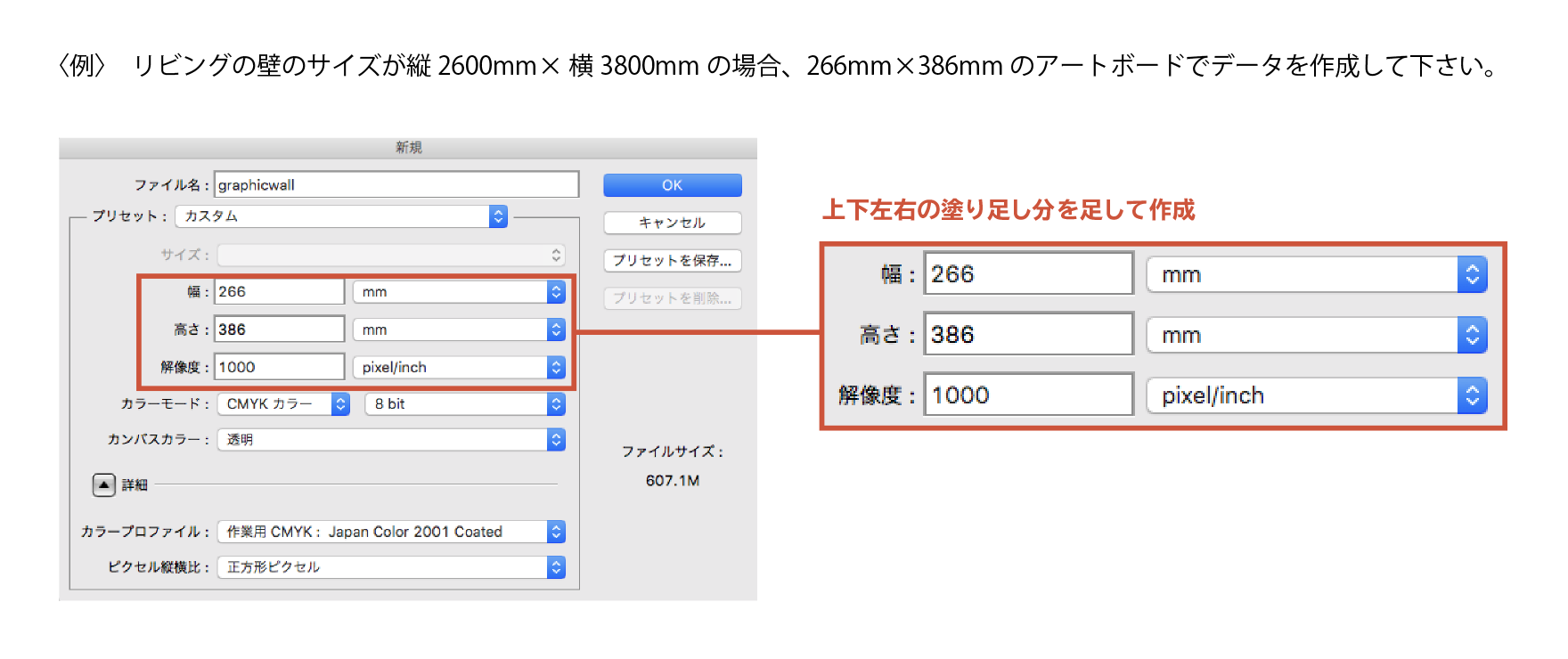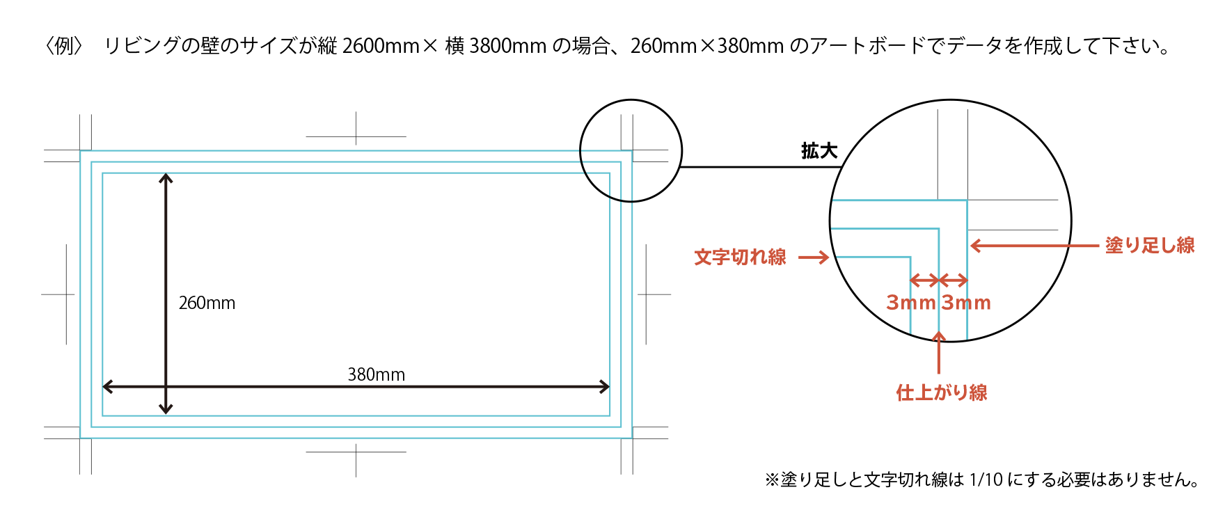 ○ サイズは1/10の寸法+上下左右の塗り足し分を足して作成して下さい。