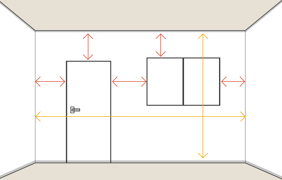 窓や扉のない壁面を測る場合は、オレンジ色矢印部分の幅と高さを測るだけです。巾木や廻り縁が設置されている場合、巾木や廻り縁部分は寸法にいれなくてかまいません。